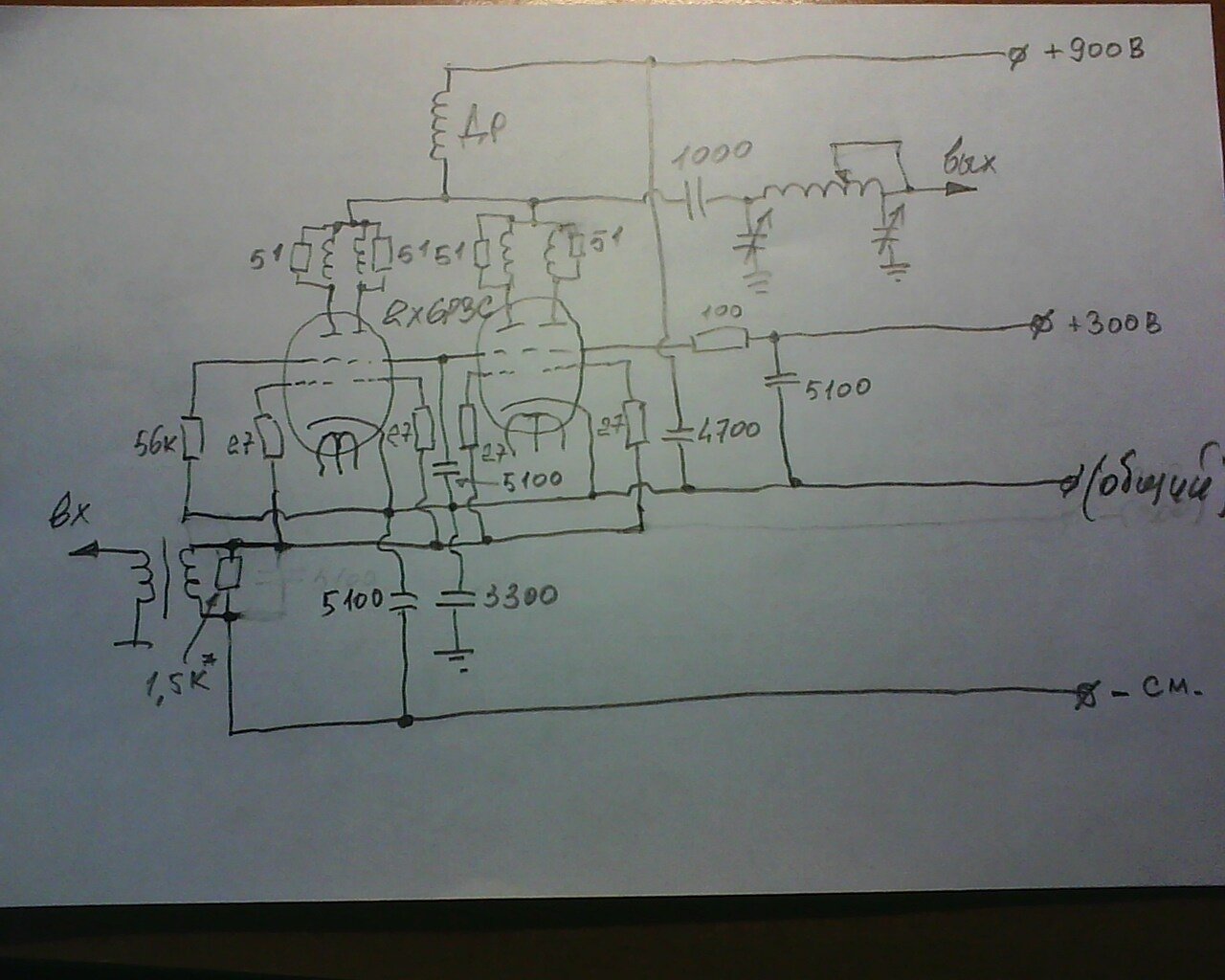 Так це вона. Правда тут в катодах стоїть резистор 1.3 ома, і качаються вони однією 1П24Б (наводить на думку, що для розкачки їм треба зовсім небагато). По напргуам: анод +370в, екран +180в і на першу сітку -24в