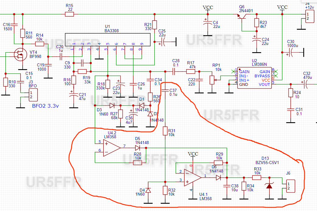 З номіналами вказаними на схемі BA3308 має діапазон АРП 60дб. Для простого приймача цього досить. Але великий дискомфорт від того що відсутня швидка АРП. Якщо на вході дуже сильний сигнал то тривалість відновлення нормального рівня підсилення дуже велика. Це вирішується досить простою схемою (обведено червоним)Працює вона наступним чином - коли сигнал вище порога спрацьовування АРП С23 та С36 заряджені до однакової напруги. Після того як сильний сигнал пропав вони починають розряджатися. Але С36 розряджається набагато швидше ніж С23. Коли різниця напруг між ними стане більша за напругу відчинення діода D3 він відкриється і подальший розряд С23 буде йти через R27 з більшою швидкістю. D3 - будь який слабосигнальний шотткі, але схема працює і з звичайним кремнієвим діодом типу 1N4148.