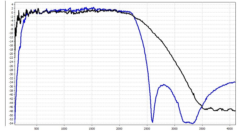 Вузький фільтр 2250Гц. Синій трек - гіратори, чорний - Саллен-Кей 9го порядку