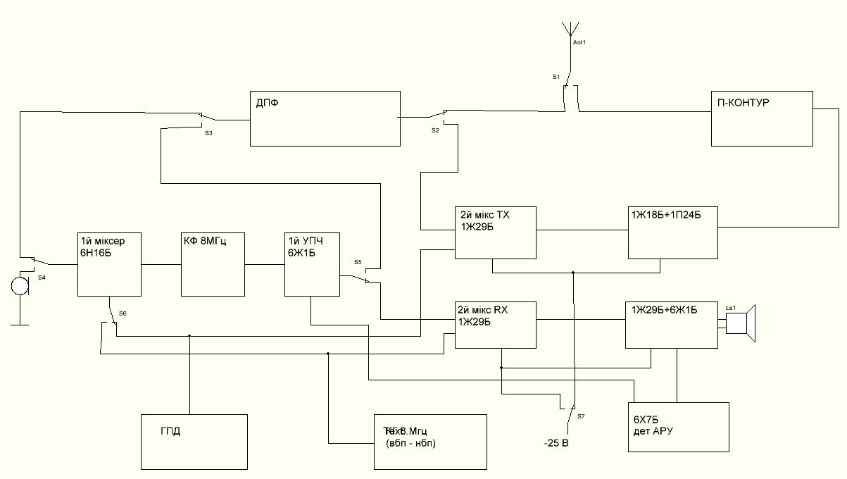 1. В режимі передачі в тебе сигнал з частотою ПЧ йде на ДПФ а потім на другий змішувач. Це та не працює :) ДПФ повинен бути після другого змішувача. Тоді змішувач має сенс зробити один який буде працювати на передачу та на приймання.