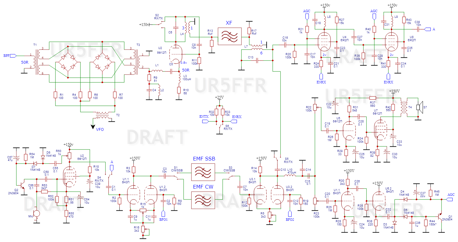 Це все дуже добре, є майже вся схема трансивера, але немає схеми драйвера та вихідного каскаду. І від цього не ясно, буде П-контур як частина дпф чи ні, чи треба робити шашлик для комутації (а це не так просто), чи обійдется все звичайним ПГК з 1-2 галетами...