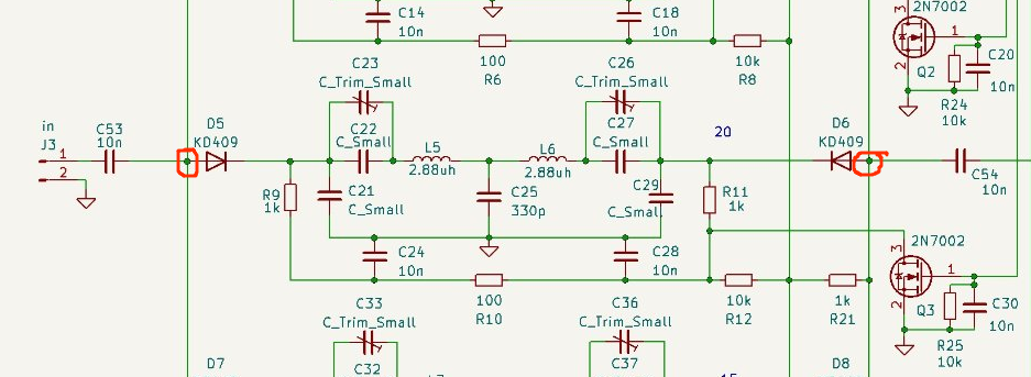 Резистори треба вибирати так щоб струм через діоди був 5-10мА. Працює все дуже просто - якщлоо через діод тече струм то він відчинений та його опір одиниці ом та менше. Якщо діод заперто зворотньой напругою то він зачинен і його опір дуже великий та дорівнює реактивному опору ємності діоду на робочій частоті