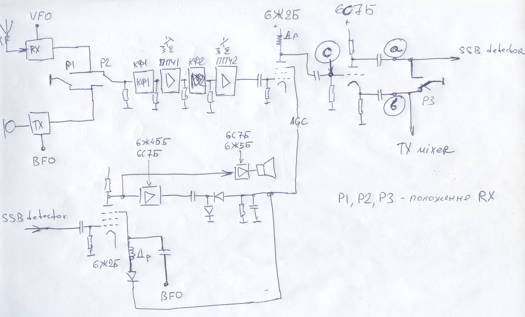 Реле Р3 у мене перемикає тріод 6С7Б, в режим з ОА (ЗА, так?), ні, писатиму звично, ОА. Так ось, перемикає в ОА на час педерачі, то норм, сигнал набагато сильніший, але, якщо підключити ССБ детектор до точки "b", тобто разом з міксером ТХ, то з нього неслабо так лізе опора, та й сигнал слабкий для повноцінного АРП, так, воно не дасть спотворень, але й не дасть отої "накачки" сигналу.