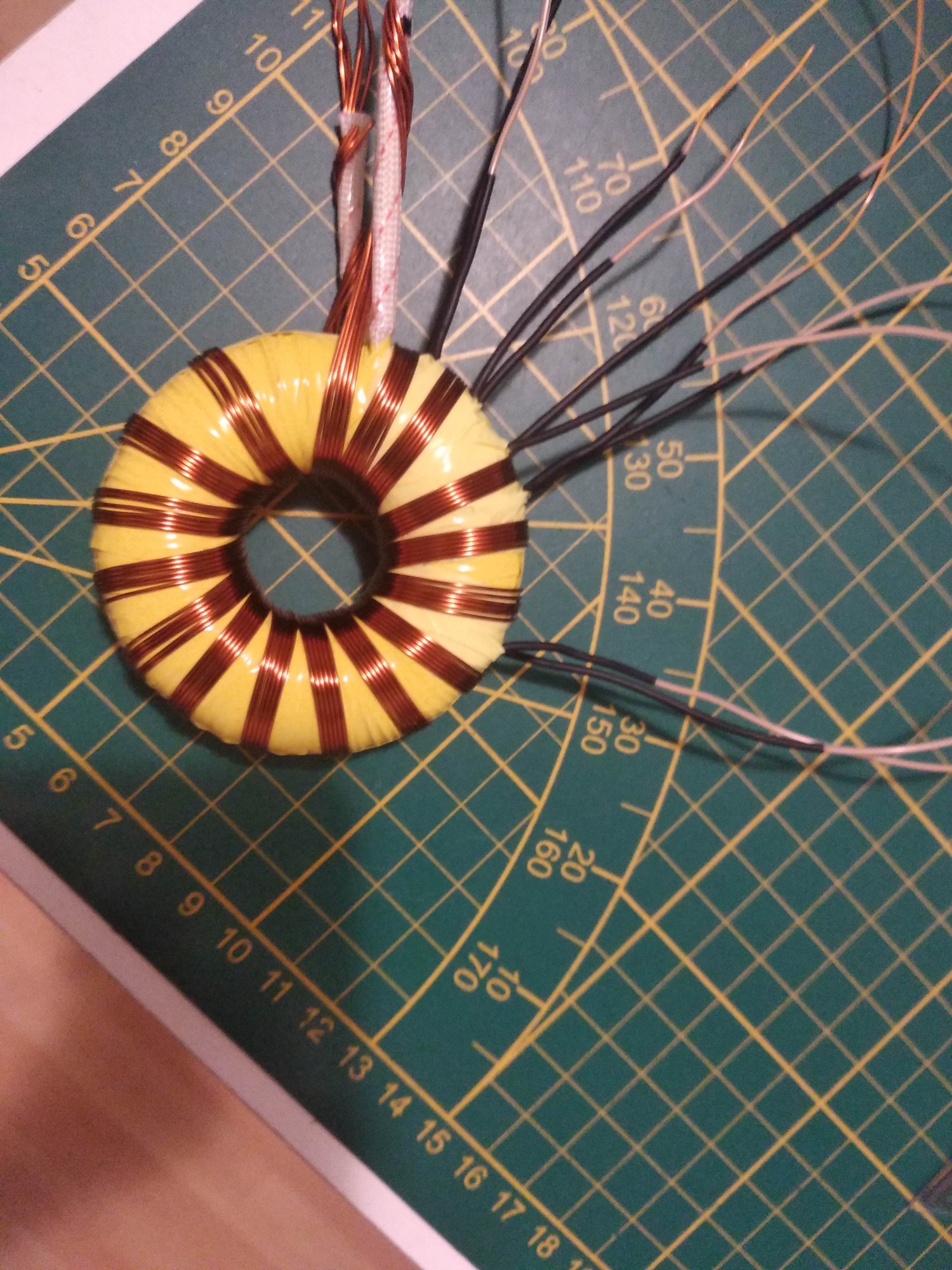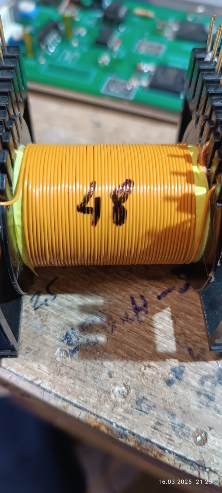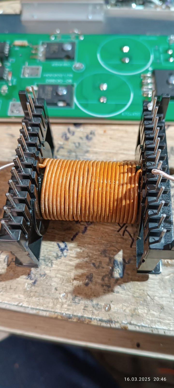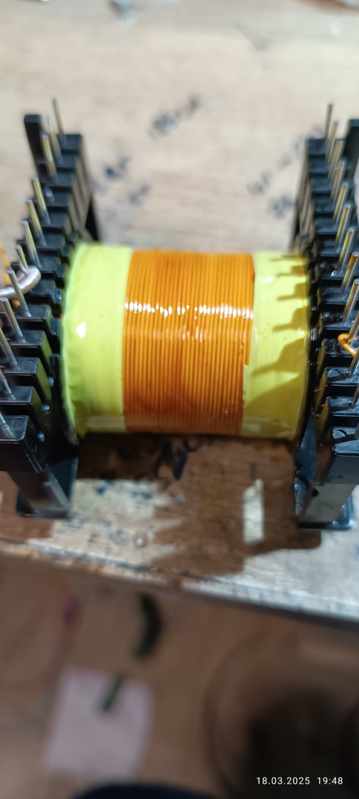 Перший ряд первинної обмотки : вторинна обмотка виглядає так: щоб витки не провалювались на краях ряду, края захищав вузькою стрічкою : Ізоляційна вогнетривка поліестерова стрічки з акриловим адгезивом. З такої ж стрічки робив і міжобмоточну та міжслойну ізоляцію.