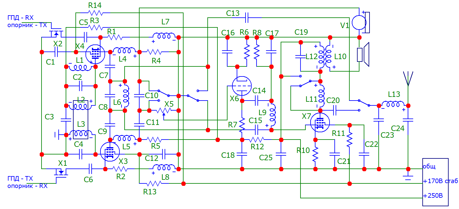 Изюмики данной схемы - не только в минимальном числе ламп, но и самодельных намоточных катушек - их всего 2 (в П-контуре, и в ДПФ). Еще одна фишка - у всех реле, через которые проходит слабый сигнал, подвижные контакты заземлены. Исключение только у реле выходного каскада, но там сигнал мощный.