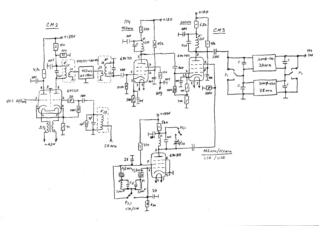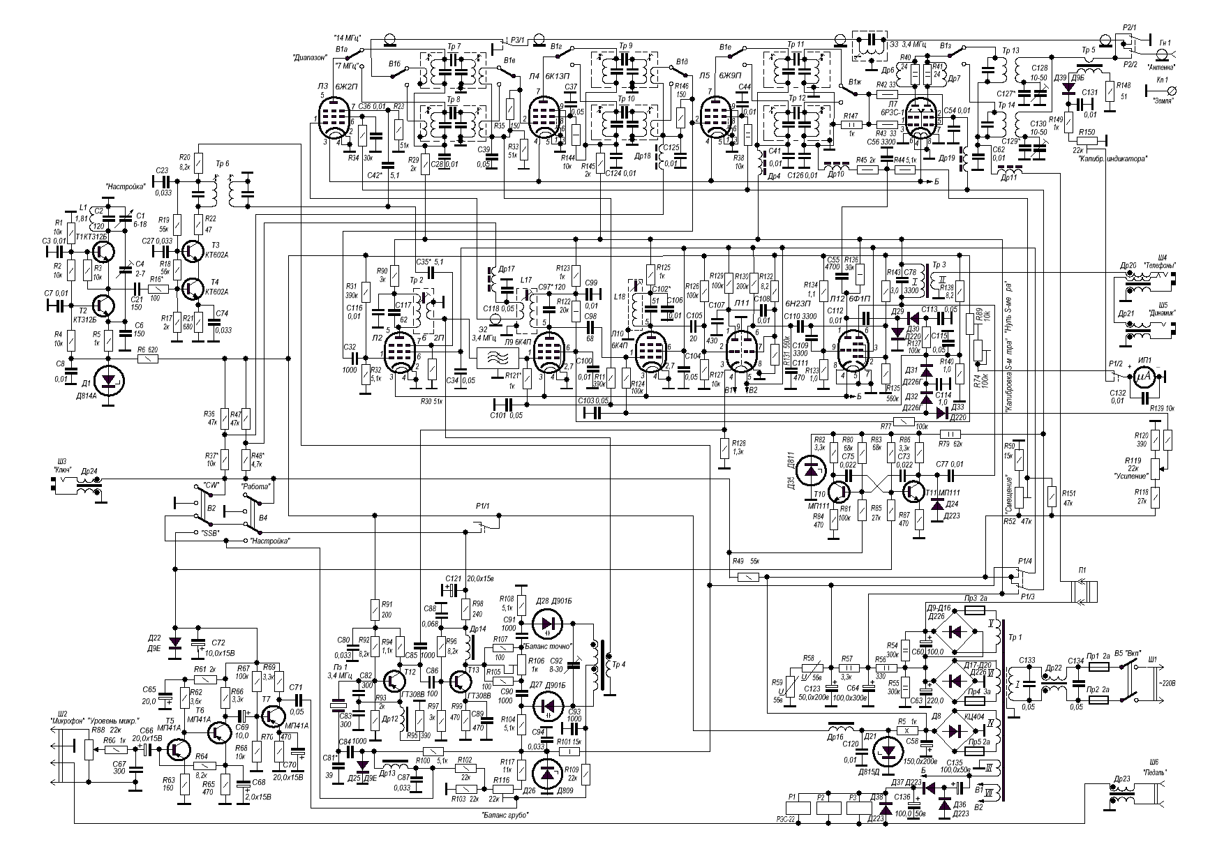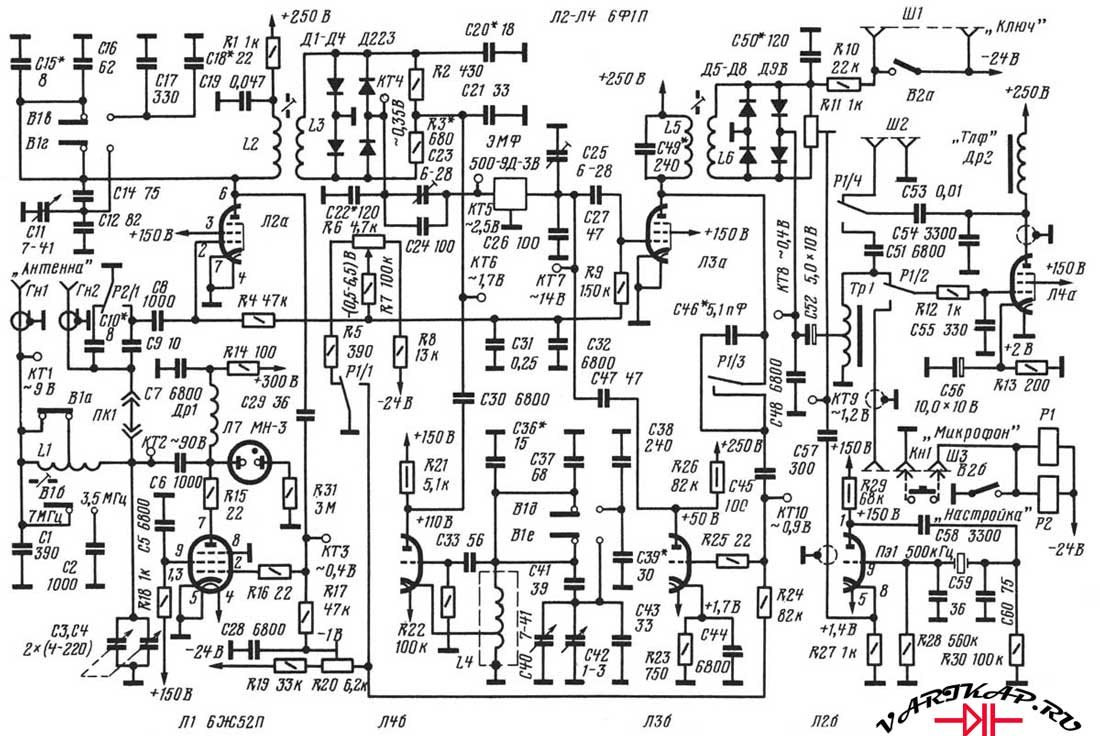 На прием работают все лампы, на передачу - все, кроме триода. Выходной пентод (на его место можно поставить более мощный 6Ф5П) также работает как выходной УНЧ на прием и выходной УВЧ на передачу.