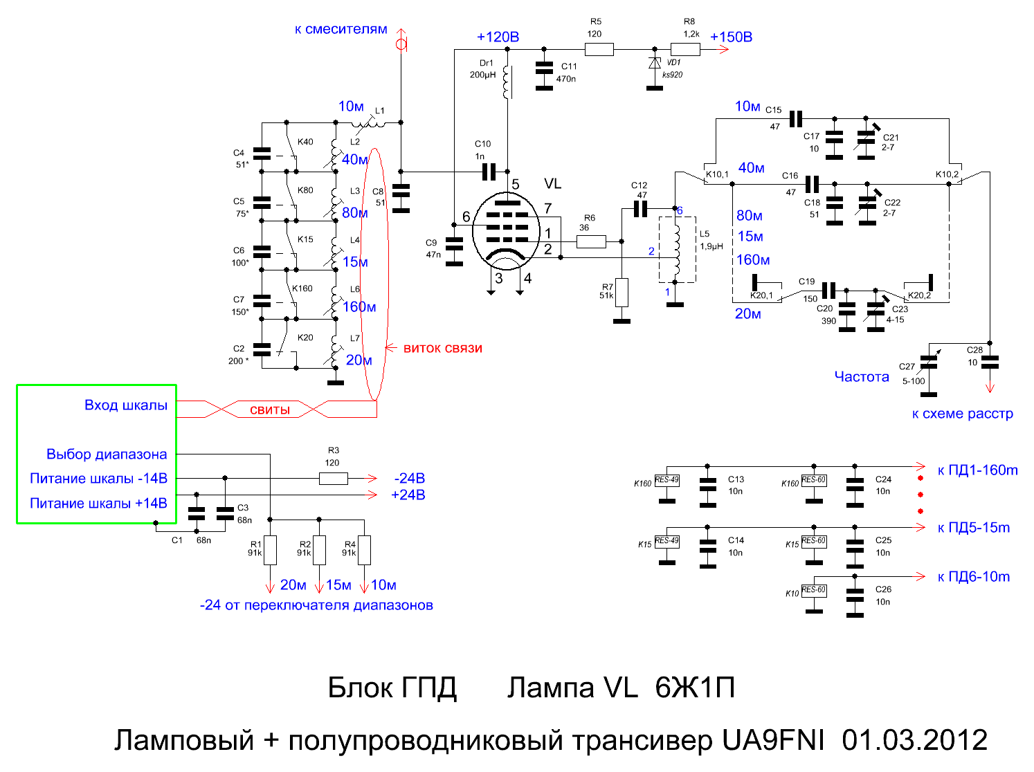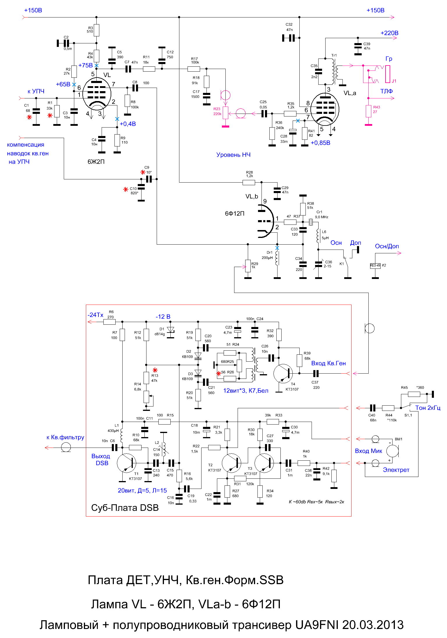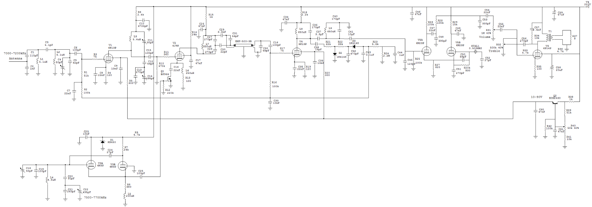 На прием работают все лампы, на передачу - все, кроме триода. Выходной пентод (на его место можно поставить более мощный 6Ф5П) также работает как выходной УНЧ на прием и выходной УВЧ на передачу.