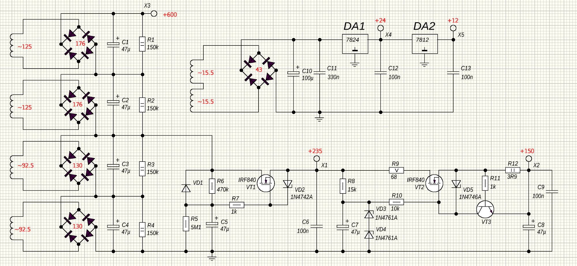 - якщо дозволите. моя думка. потрібно паралельно С1-2-3-4-5-7 додати керам конденсатори. а С -12-13 електроітичні. та ємність 47 у містках мало.   якщо 235в будуть використовуватися для сіток вих каскаду. бажано зробити стабілізатор               - а де мінусовий ланцюг? 73!