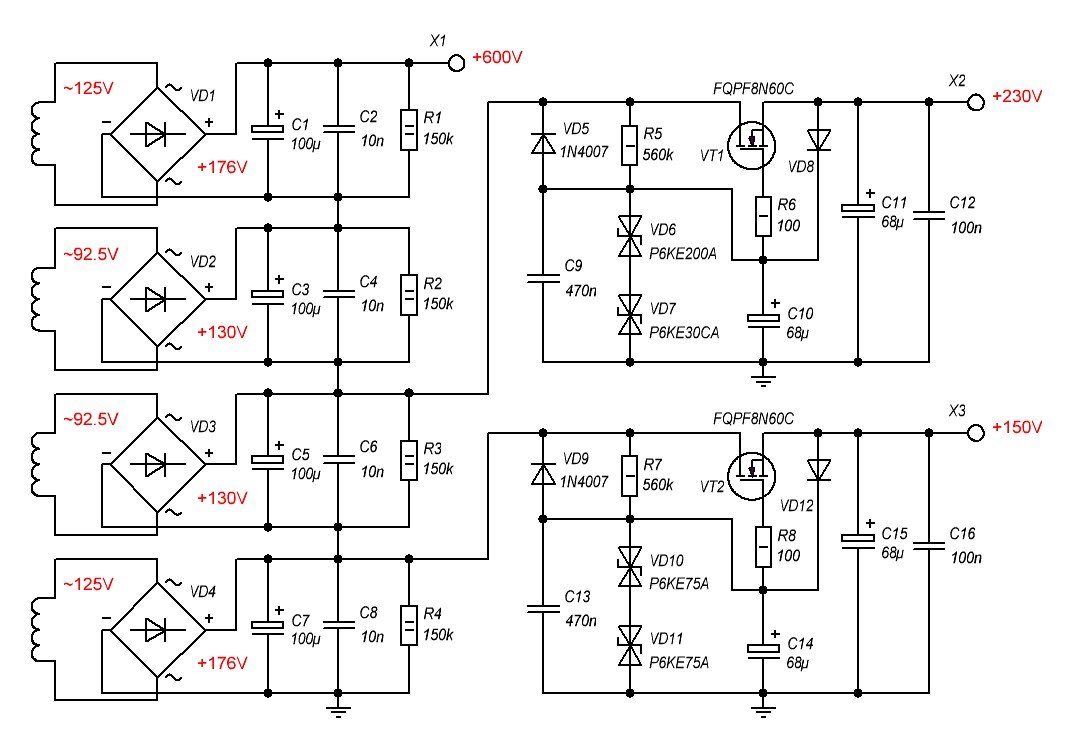 - С9, С12, С13, С16 ставте глину. Р5 Р7 560 ком багато. якщо помилка і там 5.6 ком струм для ваших стабілітронів буде 30 ма для 176в і 55ма для 306в .а скілько треба для ваших за паспортом стабілітронів просто розрахуйте і природно резистори будуть різних номіналів. 73!