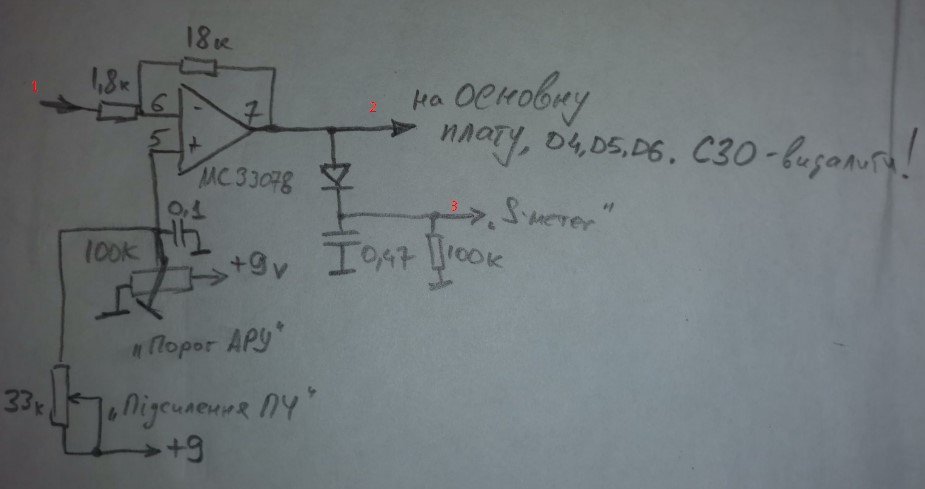 - видалено конденсатор С30, і з його лівого (по схемі) виводу, тобто входу детектора АРП виведено провідник. (т1 на картинці нижче)