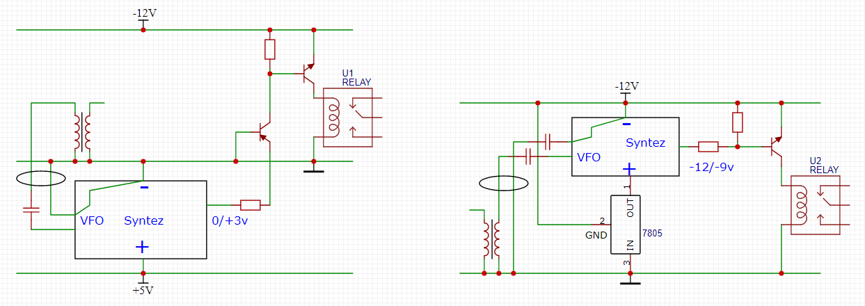 Четвертий варіант - залишити в спокої аналогову частину. Живлення зробити -12в. А ось синтез перевернуті догори ногами. Тобто його "землю" під'єднати до -12, а плюс - до землі. Тоді він буде видавати сигнали -12 (це нуль для нього) та -9 (це його 3,3в). Ставимо МП37, емітер до -12в, на базу сигнал управління -12в/-9в, у колектор - реле другим кінцем на землю