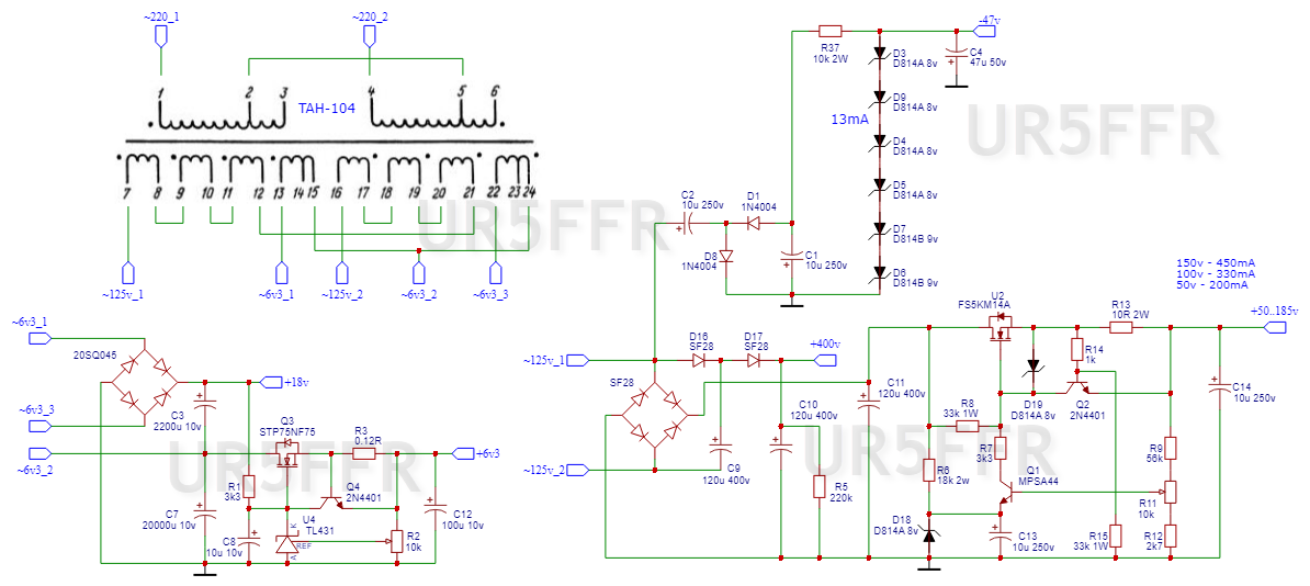 Блок побудований на основі промислового трансформатора ТАН-104. Але можна використовувати й інші трансформатори, що мають обмотки з відповідними напругами. Блок видає такі напруги