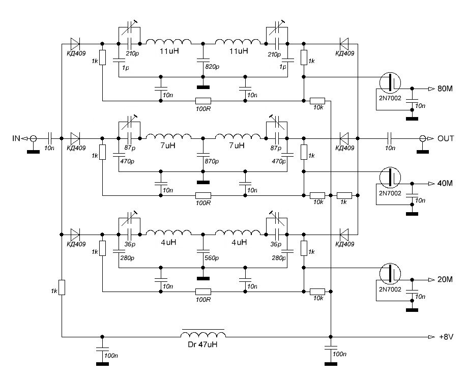 Налаштовував за допомогою NWT, схему даю. підстроювальні конденсатори ставив тільки на момент настройки, потім випаював, міряв його ємність і ставив в плату вже кераміку. На схемі номінали такі, які спаяно в плату, підстроювальні конденсатори без номіналу. Дроселі десь брав в інтернеті. MURATA, СМД 1210. Пробував мотати на кільцях 7х4х2.5 1000НМ - без змін.