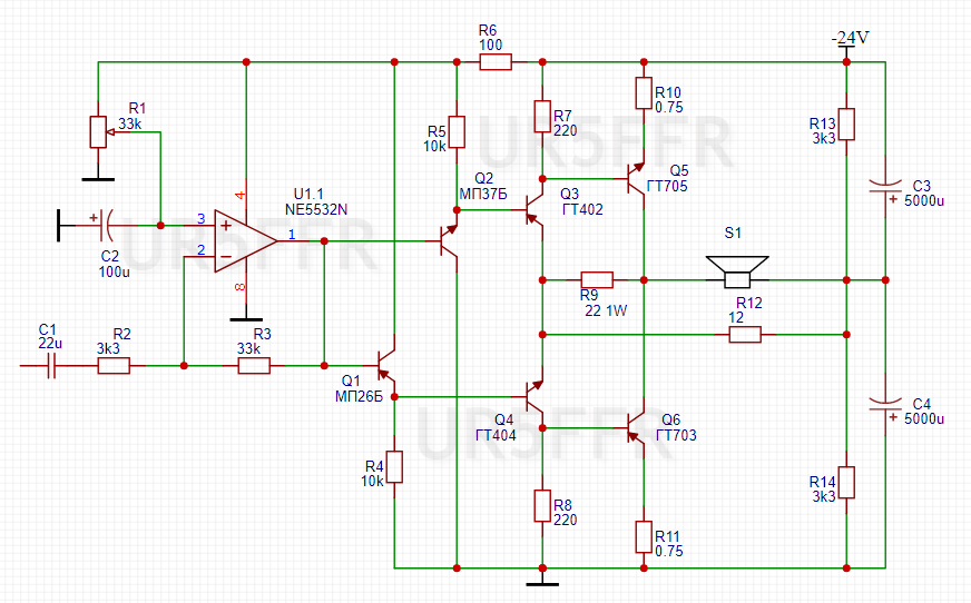Я цю схему як тільки не кромсав - і джерела струму ставив замість R4R5, номіналами грався, вводив додаткові зворотні зв'язки. Усе марно - краще не становиться. Вирішив залишити як є. Воно мінімалістично та дуже непогано грає