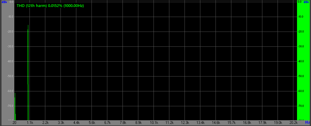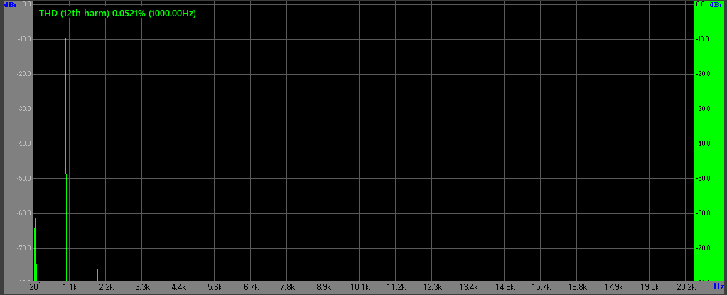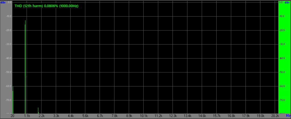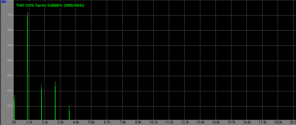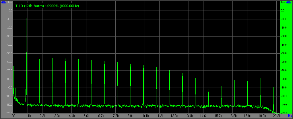 Бачимо що рівень спотворень зростає з ростом вихідної амплітуди з 0,02% до 0,1%. А після 13Vpp на виході дуже різкий стрибок спотворень і далі починається обмеження синусоїди яке видно неозброєним оком на осцилографі. Тобто більш ніж половина живлення пік-пік знімати з неї не треба. Тому в підсилювачах після неї треба ставити вихідний каскад який має коефіцієнт підсилення не менше 2. Саме такий варіант у мене в першій схемі - там ВК має підсилення 2,5 - трохи з запасом.