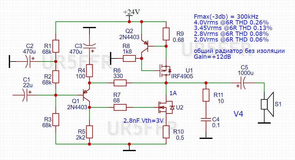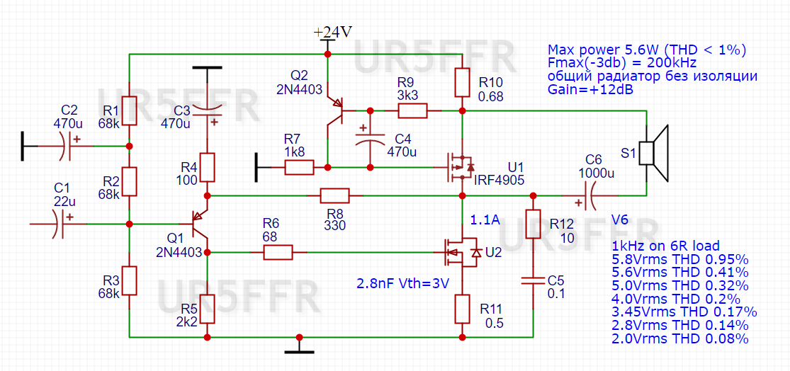 Колупав далі підсилювач у класі А. Максимальна потужність схеми 2.7 Вт. Це ККД лише 11%. Ну таке. По відгукам у мережі воно так у всіх працює. Щоб покращити ККД вводять зворотній зв'язок. Ось типова схема такого рішення