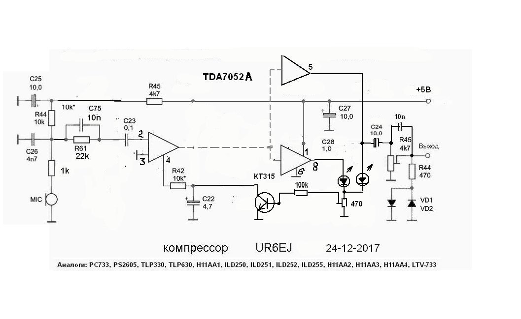 Зібрав плату Клопіка працює добре но мікрофонний підсилювач хотілося б з компресором.Є мікросхема ВА3308 .Погуглив декілька схем но дуже багато об'вязки та ні на всіх схемах є регулятор компрессі. Поділіться будь ласка схемоюможе є в кого?