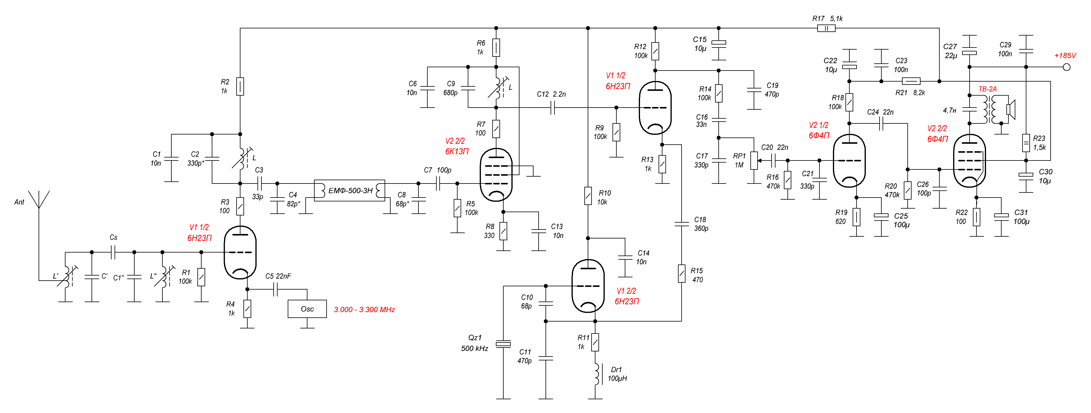 Це схема з Радіомір КВ/УКВ №10,11/2009 за авторством нібито RU6BK. Але якщо бути коректним то усе що зробив RU6BK - це зібрав чужу конструкцію на радянських лампах. В журналі він пише начебто переробив схему, але це не так. Ось оригінальна схема за авторства IW9HJV та IW9ARO
